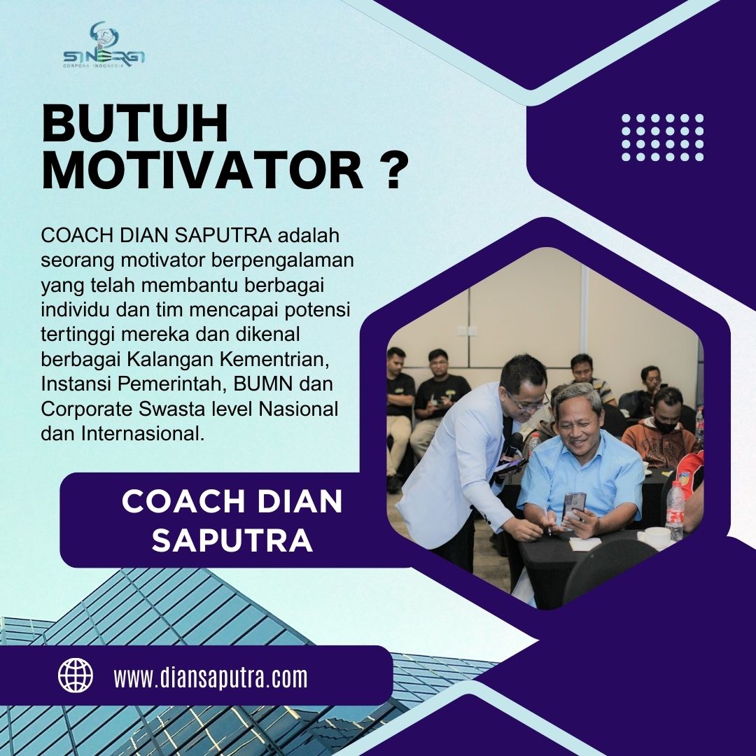 Anda Berada di Info Yang Tepat. Dian Saputra adalah seorang Motivator sekaligus Trainer sinergi corpora Indonesia yang sudah berpengalaman selama 13 Tahun. Coach Dian Saputra selalu memberikan materi yang fun dan Berdampak guna meningkatkan kinerja dan produktivitas SDM di Bisnis Anda. Coach Dian Saputra dikenal oleh Kalangan Corporate Seperti BUMN, Dinas Pemerintah, Kementerian, Hingga Corporate Swasta Lainnya berskala Nasional dan Internasional.