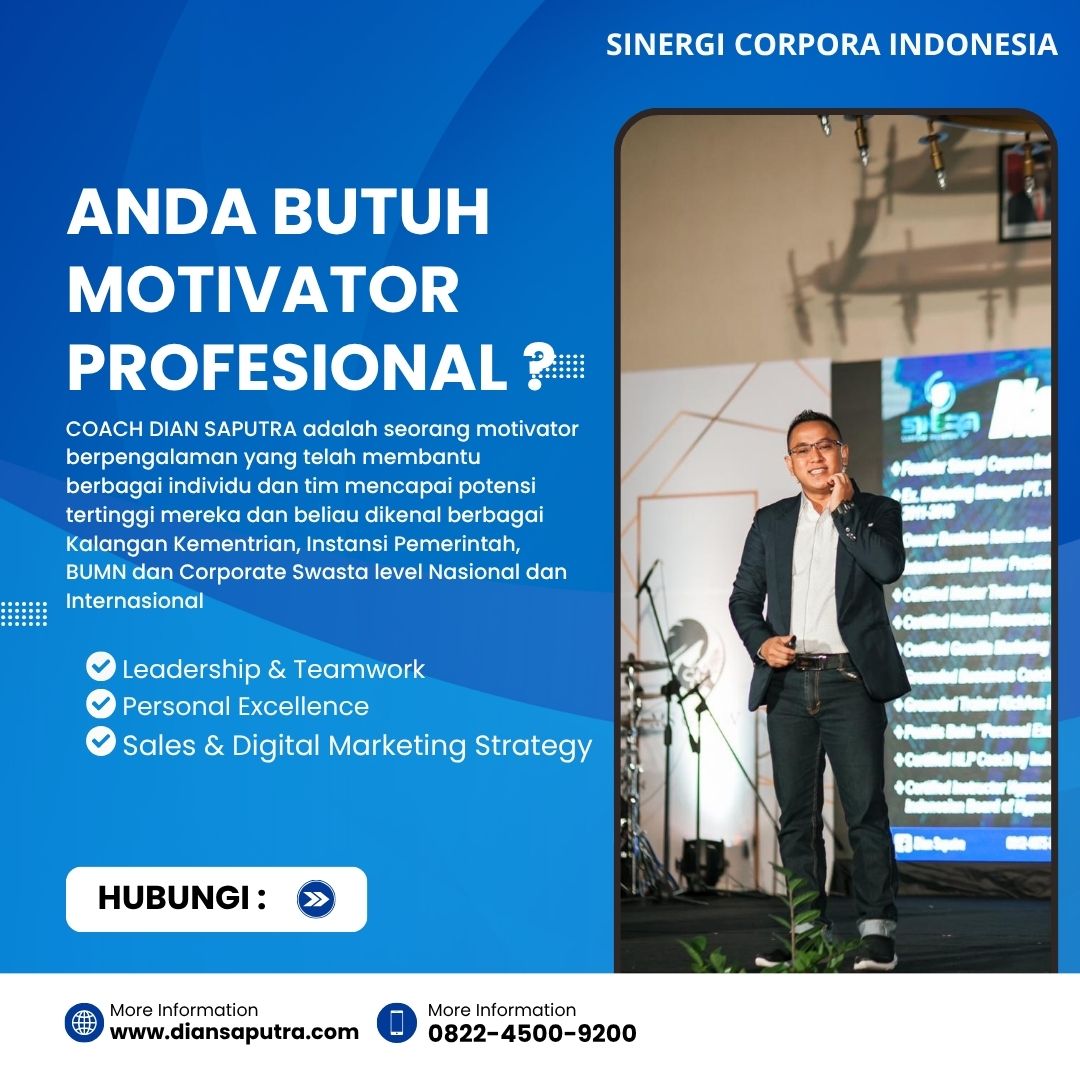 Sinergi Corpora Indonesia hadir sebagai mitra strategis bagi perusahaan yang ingin mengangkat kualitas SDM dan bisnisnya ke level berikutnya. Sinergi Corpora Indonesia di pimpin oleh Coach Dian Saputra yang sebagai Jasa Trainer Motivator Leadership Magelang dengan pengalaman lebih dari 10 tahun melayani berbagai kementerian, instansi pemerintah, BUMN maupun korporasi swasta nasional dan internasional, kami menggabungkan keilmuan berbasis psikologi modern serta aspek spiritual untuk menghasilkan hasil yang nyata. Materi kami disusun berdasarkan riset mutakhir, dan setiap program menghadirkan nuansa fun, aplikatif dan solutif sehingga peserta tidak hanya memahami, tetapi juga mampu mengaplikasikan dalam kehidupan profesional mereka.