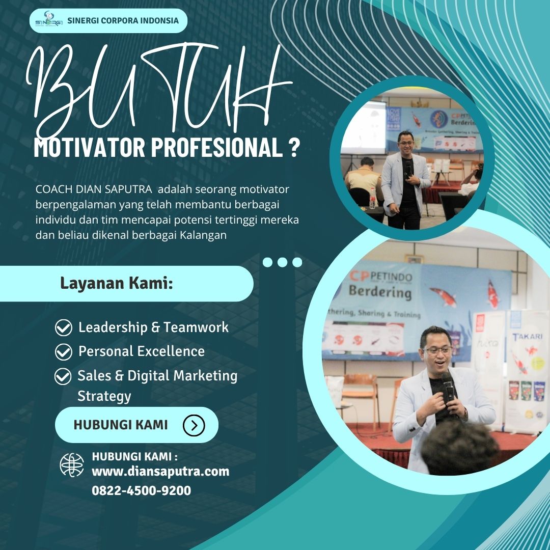 Sinergi Corpora Indonesia, yang dipimpin oleh Coach Dian Saputra, hadir sebagai perusahaan terdepan dalam jasa pelatihan dan konsultasi pengembangan Sumber Daya Manusia (SDM), yang berdiri sejak tahun 2011. Dengan pondasi ilmu psikologi modern yang berpadu dengan pendekatan spiritual, Coach Dian Saputra sebagai Jasa motivator sales Yogyakarta telah di percaya oleh berbagai kementerian, instansi pemerintah, BUMN, serta korporasi swasta baik nasional maupun internasional