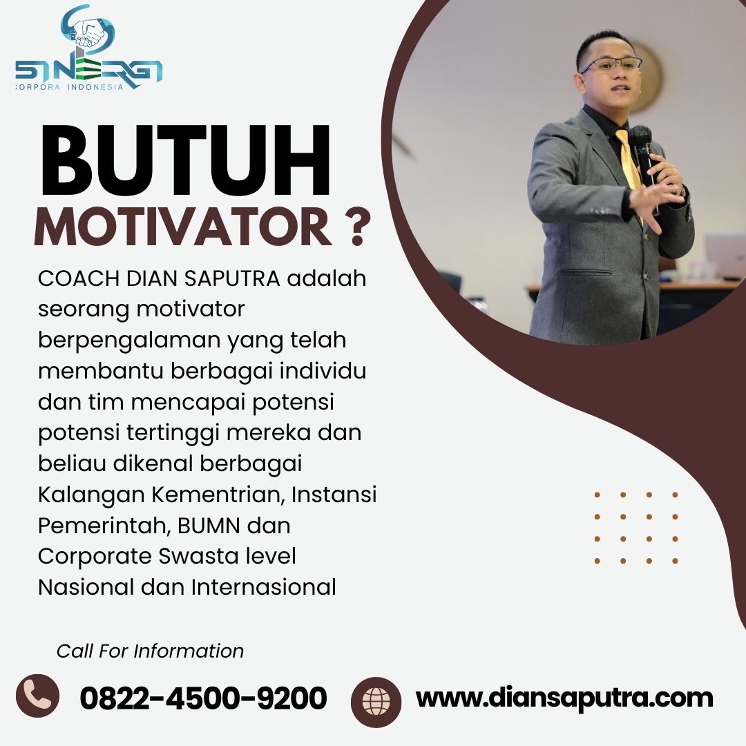 Coach Dian Saputra adalah seorang Jasa Motivator Leadership profesional yang menjadi founder Sinergi Corpora Indonesia. Dengan pengalaman lebih dari satu dekade dalam bidang training motivasi, leadership, communication skill, dan organizational development, beliau dikenal sebagai coach yang inspiratif, komunikatif, serta mampu membangun suasana pelatihan yang menyenangkan dan penuh nilai pembelajaran. Pendekatan beliau menekankan transformasi pola pikir, karakter, serta peningkatan kemampuan praktis peserta agar mampu menghadapi tantangan kerja dan kehidupan dengan lebih percaya diri dan produktif.