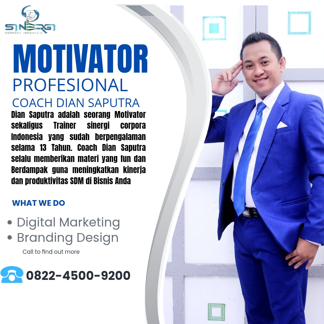 Coach Dian Saputra adalah seorang Jasa Trainer Motivator Sales profesional yang menjadi founder Sinergi Corpora Indonesia. Dengan pengalaman lebih dari satu dekade dalam bidang training motivasi, leadership, communication skill, dan organizational development, beliau dikenal sebagai coach yang inspiratif, komunikatif, serta mampu membangun suasana pelatihan yang menyenangkan dan penuh nilai pembelajaran. Pendekatan beliau menekankan transformasi pola pikir, karakter, serta peningkatan kemampuan praktis peserta agar mampu menghadapi tantangan kerja dan kehidupan dengan lebih percaya diri dan produktif.
