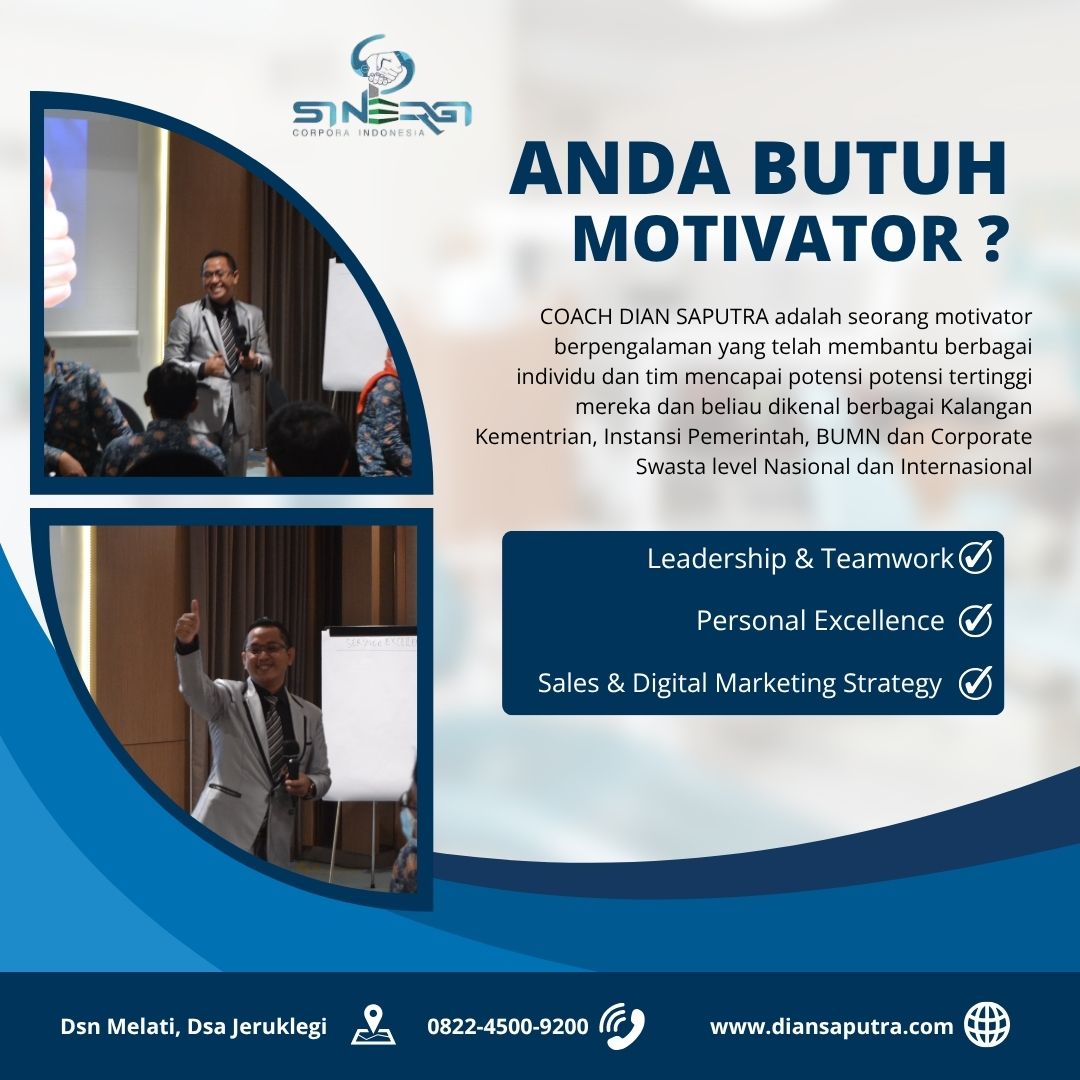 Anda Berada di Info Yang Tepat. Dian Saputra adalah seorang Motivator sekaligus Trainer sinergi corpora Indonesia yang sudah berpengalaman selama 13 Tahun. Coach Dian Saputra selalu memberikan materi yang fun dan Berdampak guna meningkatkan kinerja dan produktivitas SDM di Bisnis Anda. Coach Dian Saputra dikenal oleh Kalangan Corporate Seperti BUMN, Dinas Pemerintah, Kementerian, Hingga Corporate Swasta Lainnya berskala Nasional dan Internasional.