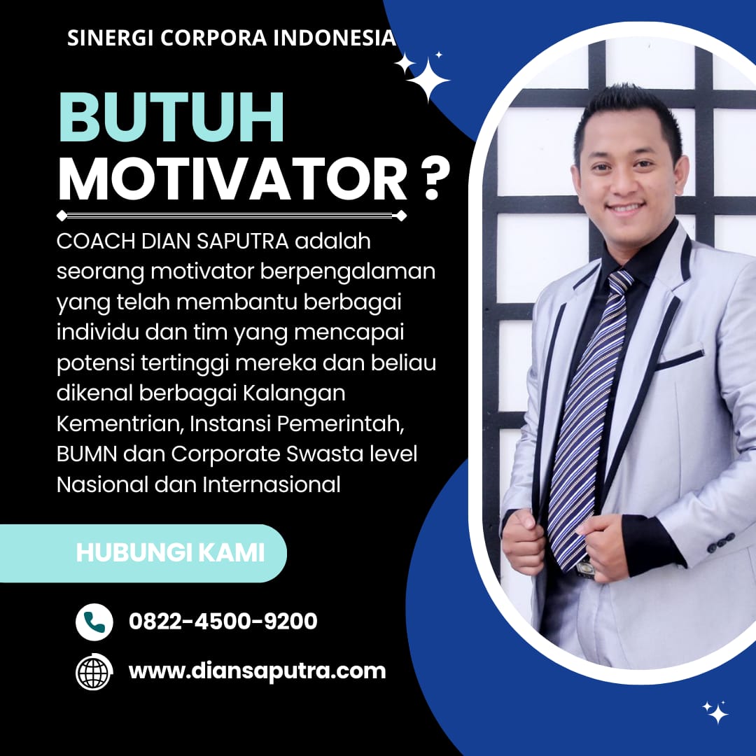 Anda Berada di Info Yang Tepat. Dian Saputra adalah seorang Motivator sekaligus Trainer sinergi corpora Indonesia yang sudah berpengalaman selama 13 Tahun. Coach Dian Saputra selalu memberikan materi yang fun dan Berdampak guna meningkatkan kinerja dan produktivitas SDM di Bisnis Anda. Coach Dian Saputra dikenal oleh Kalangan Corporate Seperti BUMN, Dinas Pemerintah, Kementerian, Hingga Corporate Swasta Lainnya berskala Nasional dan Internasional.