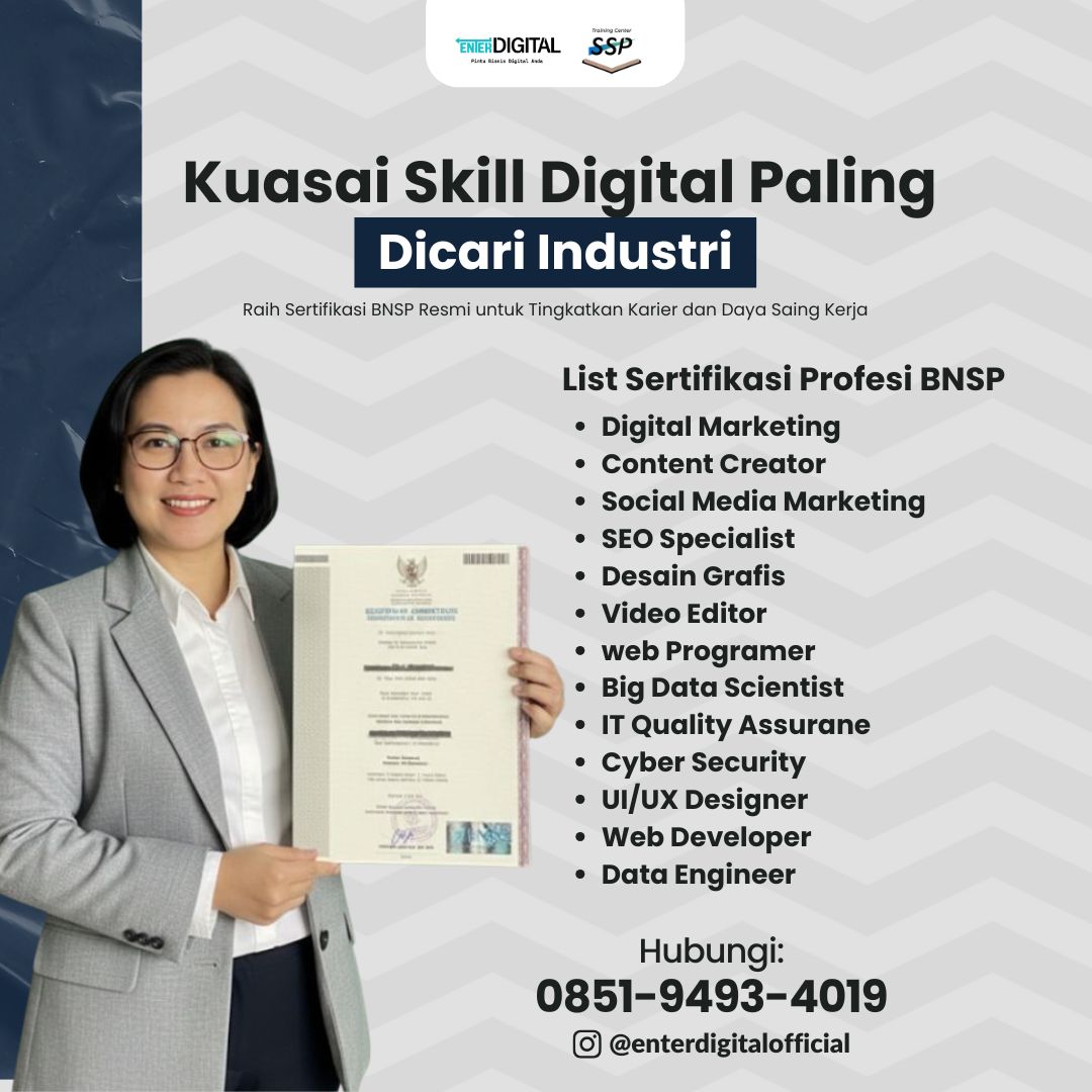 Kini saatnya kamu mengikuti Sertifikasi Digital Marketing, Content Creator, Social Media Marketing, dan SEO Specialist bersama EnterDigital, lembaga pelatihan dan sertifikasi resmi berlisensi BNSP (Badan Nasional Sertifikasi Profesi).