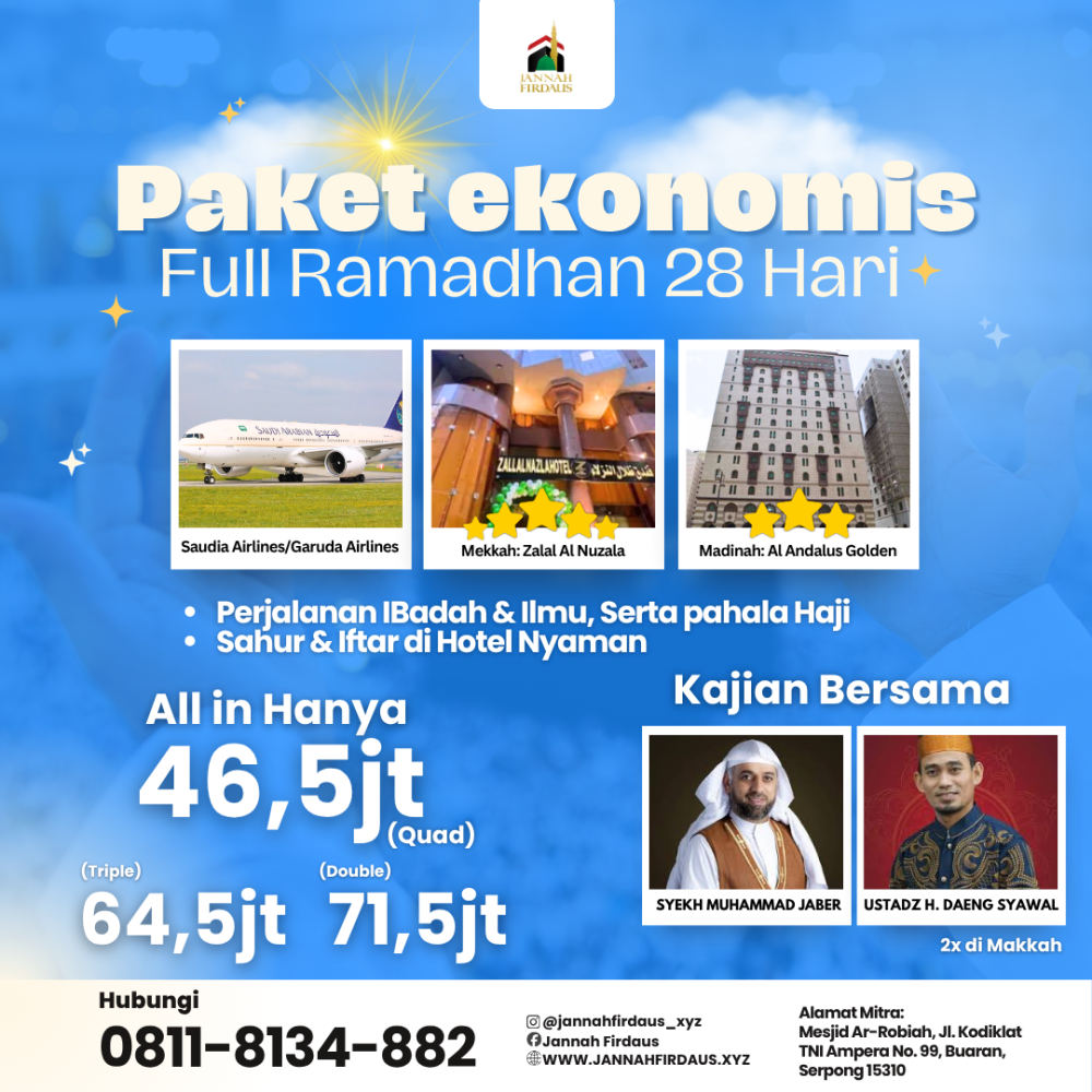 Untuk pasangan muda, tersedia juga Paket Umroh Couple dan Paket Umroh Plus Nikah di Tanah Suci, menjadikan ibadah umroh sebagai awal perjalanan hidup yang penuh berkah. Bagi yang ingin kemudahan dalam pembayaran, Jannah Firdaus menyediakan opsi Paket Umroh Cicilan, sehingga berangkat ibadah tidak perlu menunggu lama.