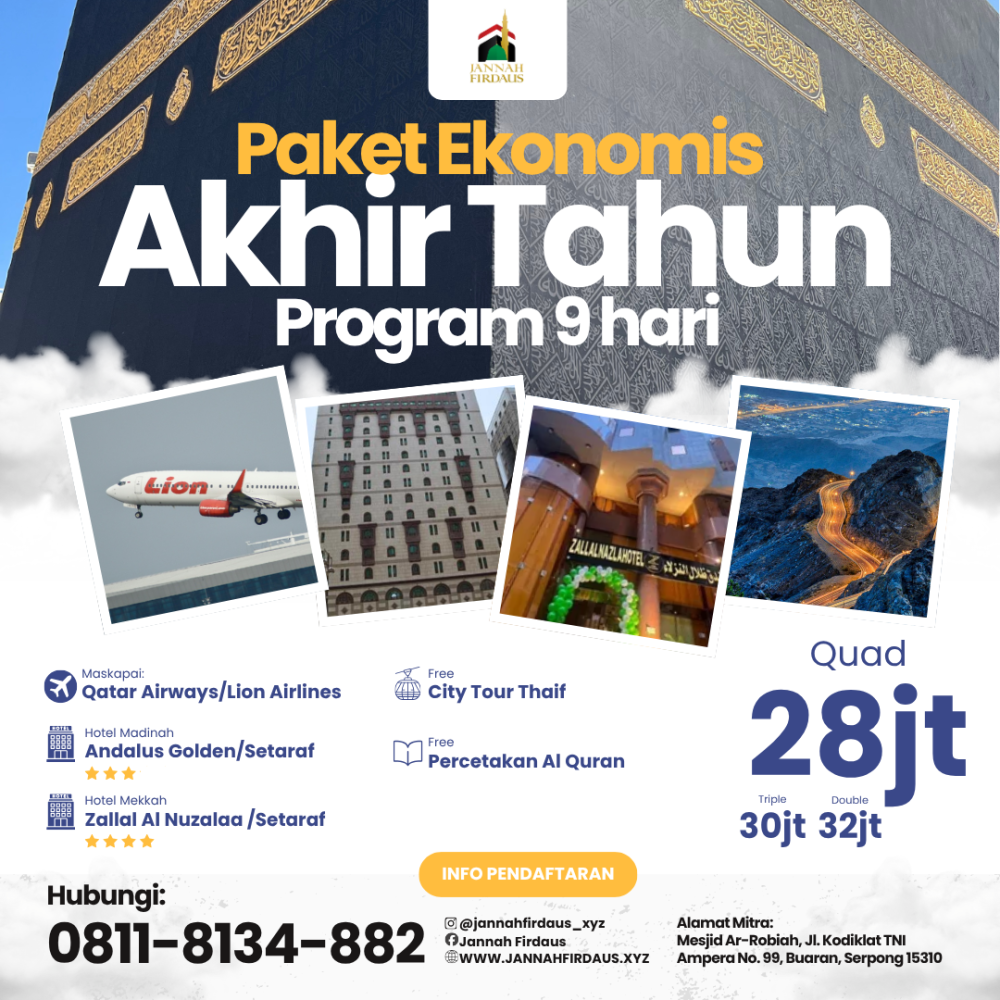 Sebagai Travel Umroh Akreditasi A dan resmi di bawah naungan Kementerian Agama, Jannah Firdaus memastikan setiap keberangkatan berjalan dengan aman, nyaman, dan terjadwal rapi. Kami berkomitmen memberikan pelayanan terbaik bagi jamaah yang ingin memaksimalkan ibadah di bulan suci, mulai dari manasik hingga kepulangan ke tanah air.