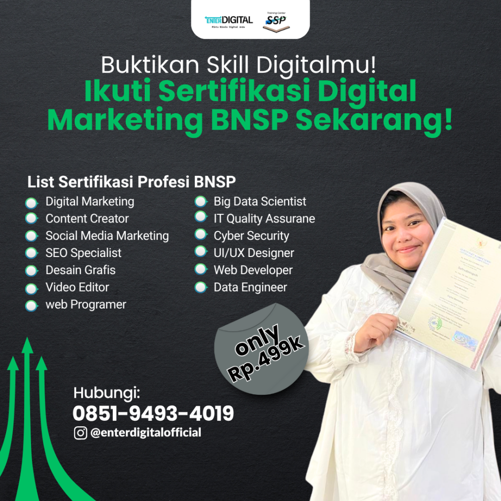 Daftar sekarang dan raih sertifikat BNSP Digital Marketing, Content Creator, Social Media Marketing, atau SEO Specialist bersama EnterDigital