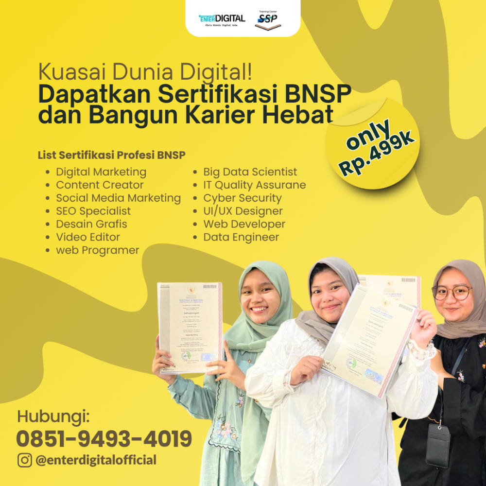 Melalui Sertifikasi Resmi BNSP dari EnterDigital, kamu bisa membuktikan kemampuan profesionalmu di bidang Digital Marketing, Content Creator, Social Media Marketing, dan SEO Specialist — baik melalui pelatihan online maupun offline.