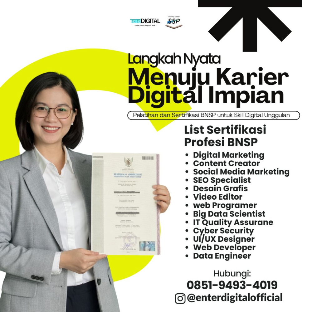 Kini saatnya kamu mengikuti Sertifikasi Digital Marketing, Content Creator, Social Media Marketing, dan SEO Specialist bersama EnterDigital, lembaga pelatihan dan sertifikasi resmi berlisensi BNSP (Badan Nasional Sertifikasi Profesi).