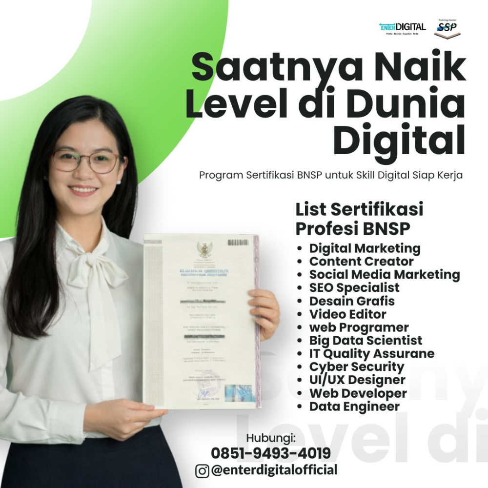 Jika kamu ingin diakui sebagai ahli digital, inilah waktunya ikut Program Sertifikasi Resmi BNSP 2025 dari EnterDigital, lembaga pelatihan dan uji kompetensi profesional di bidang Digital Marketing, Content Creator, Social Media Marketing, dan SEO Specialist.