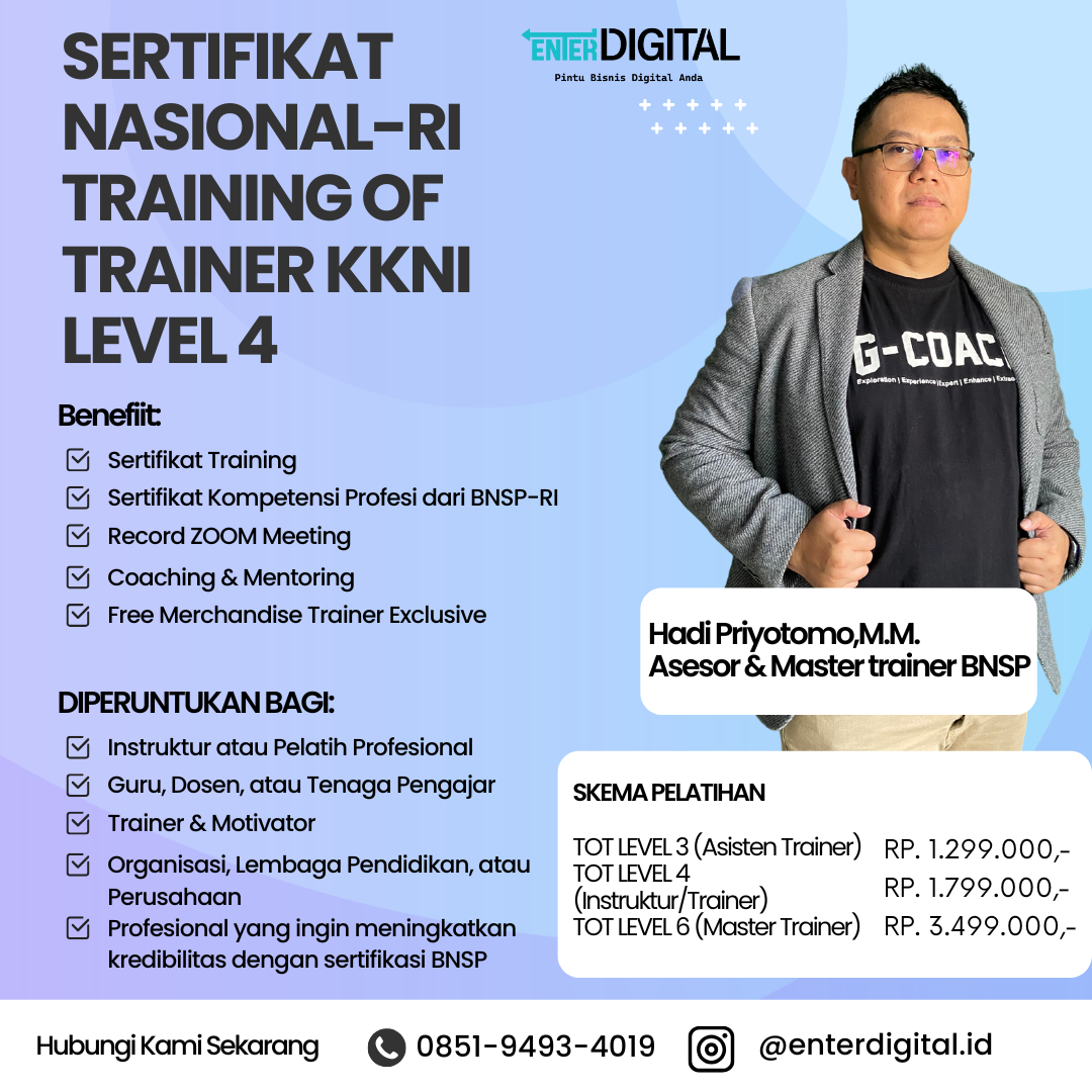 Dapatkan sertifikat TOT BNSP dari Enter Digital dan buktikan kualitas pengajaran Anda dengan menjadi trainer yang diakui. Tingkatkan keterampilan mengajar, buka peluang karir, dan wujudkan impian Anda untuk menjadi pengajar yang sukses!